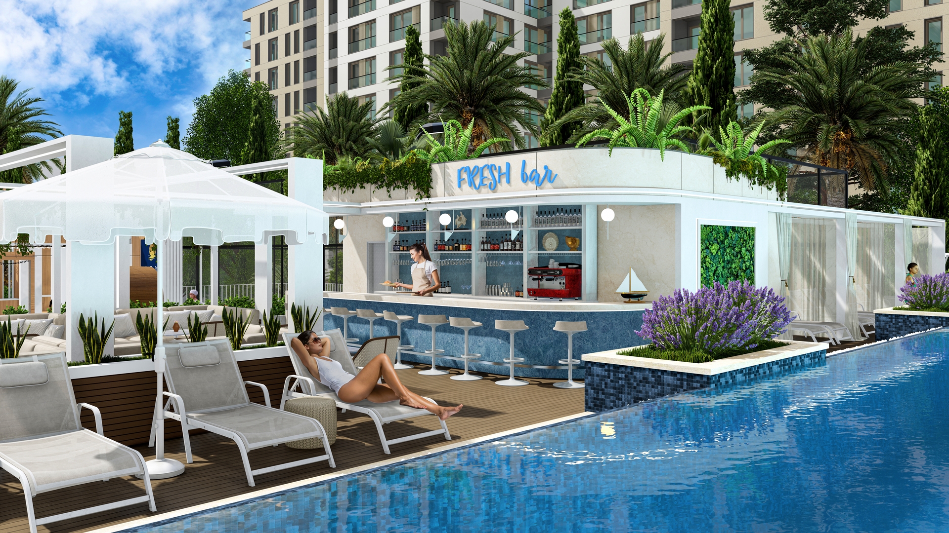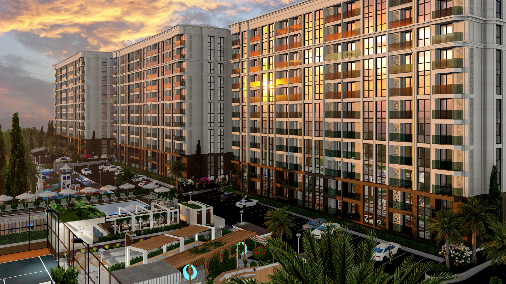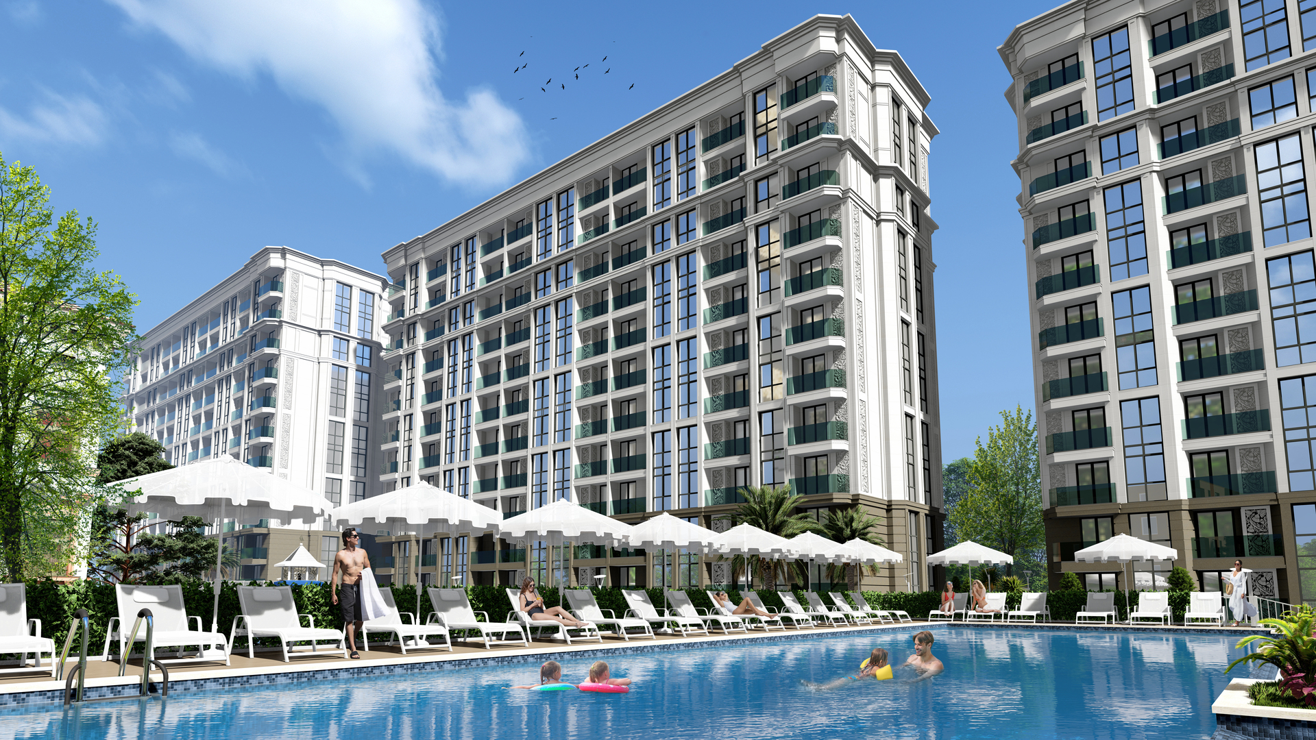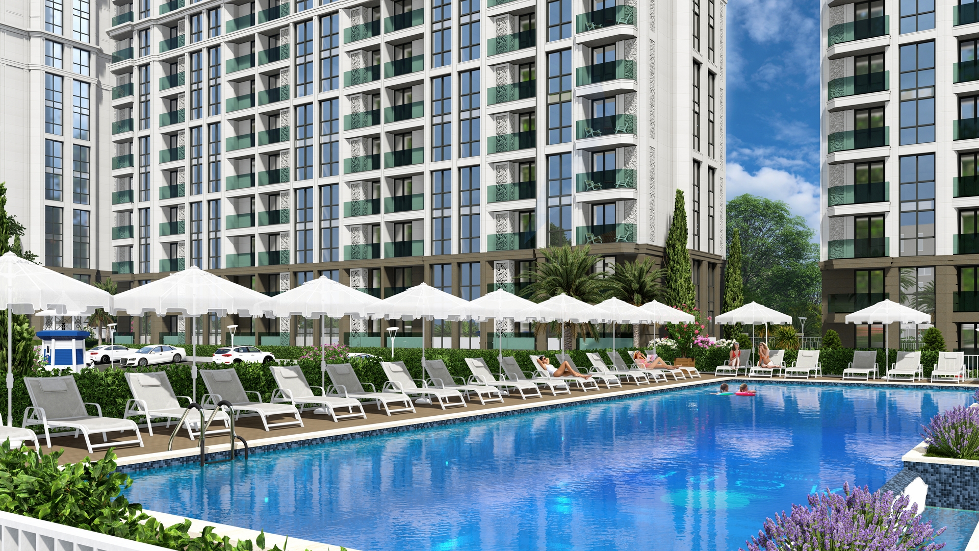 Собственный бассейн и ландшафтный парк мирового уровня для жителей комплекса.